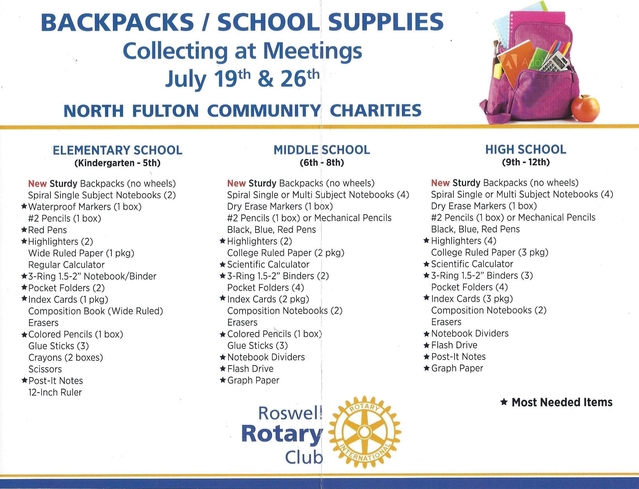 Roswell Rotary collects backpacks and school supplies for children supported through North Fulton Community Charities (NFCC). This organization provides food, clothing and other services to needy families and individuals living below the poverty level in the Roswell/North Fulton community. This year we filled 28 backpacks with supplies and club members donated $250 to the effort.