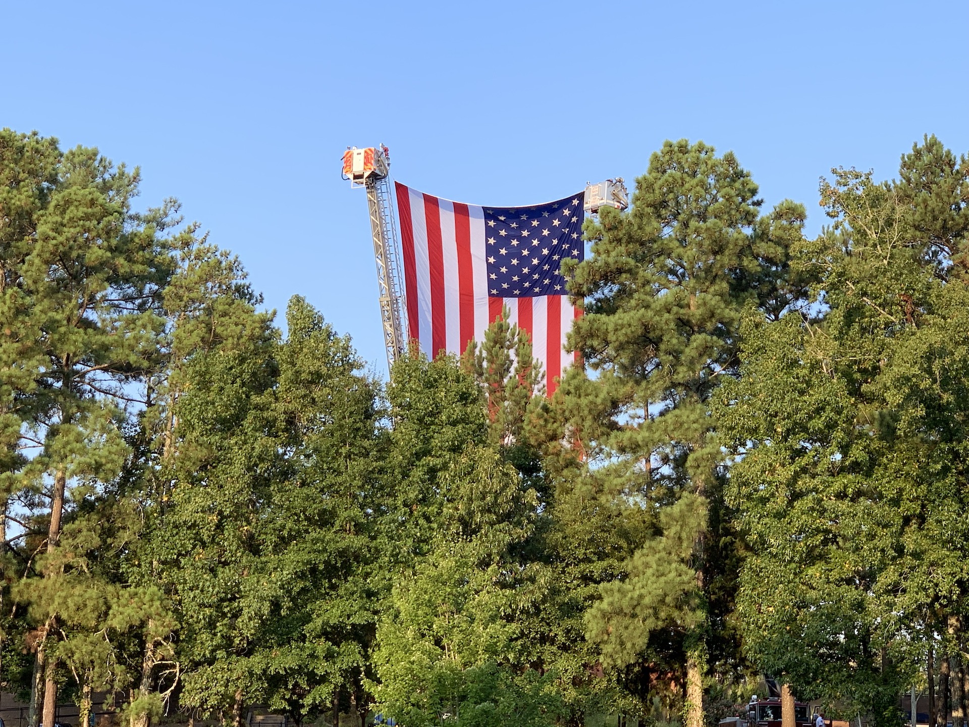 A blend of solemn remembrances, prayers and patriotic music punctuated this time of reflection with a backdrop of a giant American flag hanging from fire truck ladders and a mournful closing of taps.