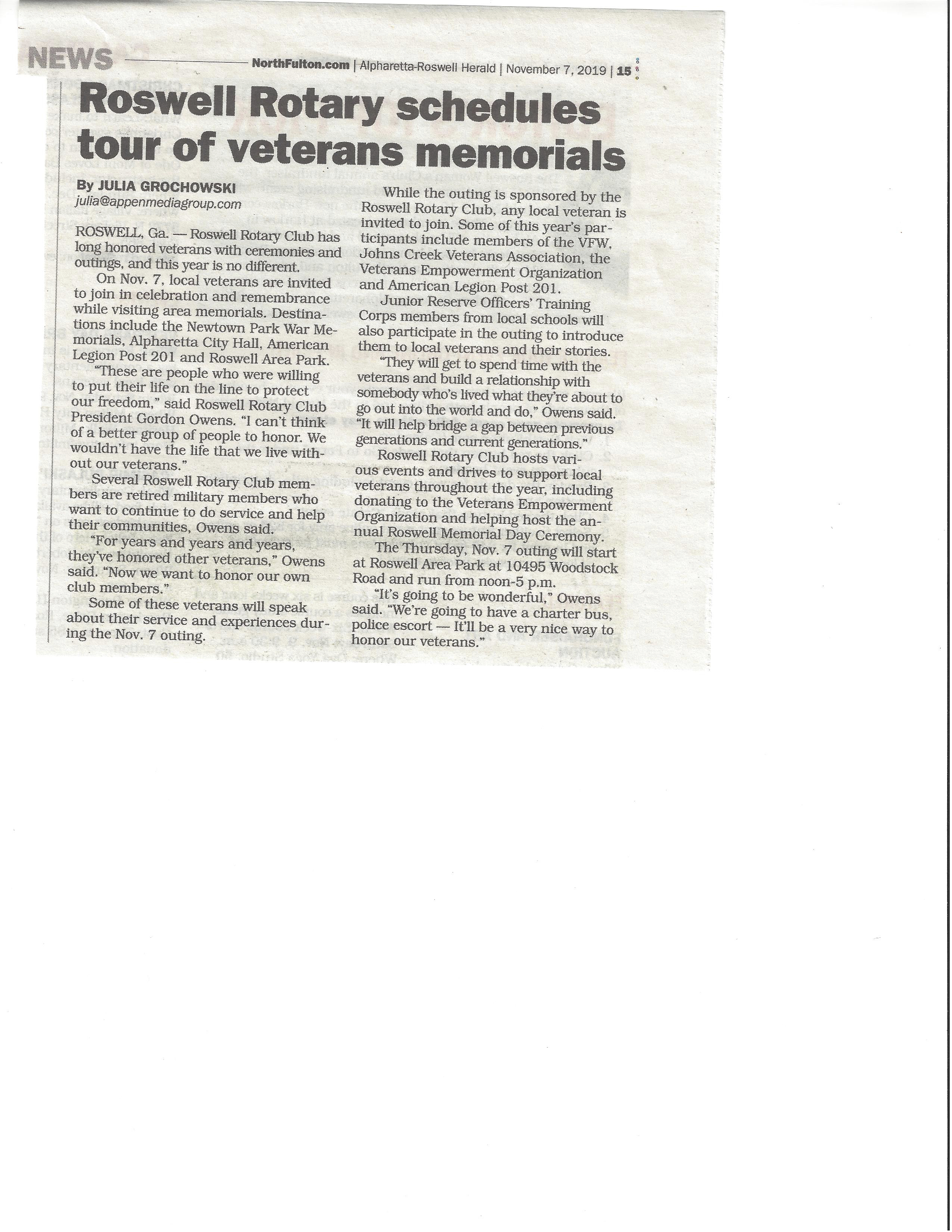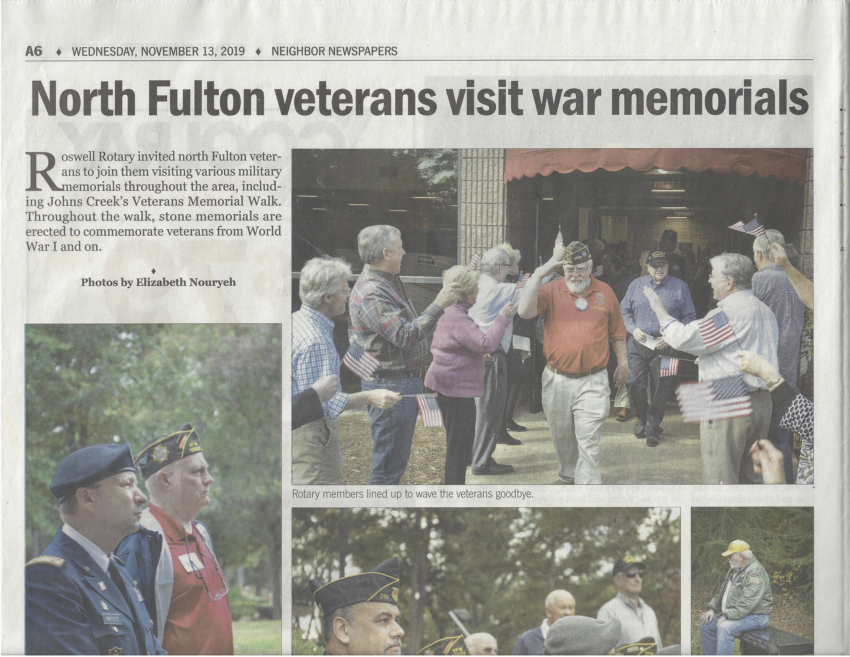 At the end of our program, members of the club lined the exit all the way to a charter bus holding American Flags and cheering for our veterans as they exited the meeting. Roswell Fire Department had a huge American Flag draped from a ladder truck to honor our veterans as we departed. Roswell Police Department provided us with a police escort as we visited several local war memorials and parks.