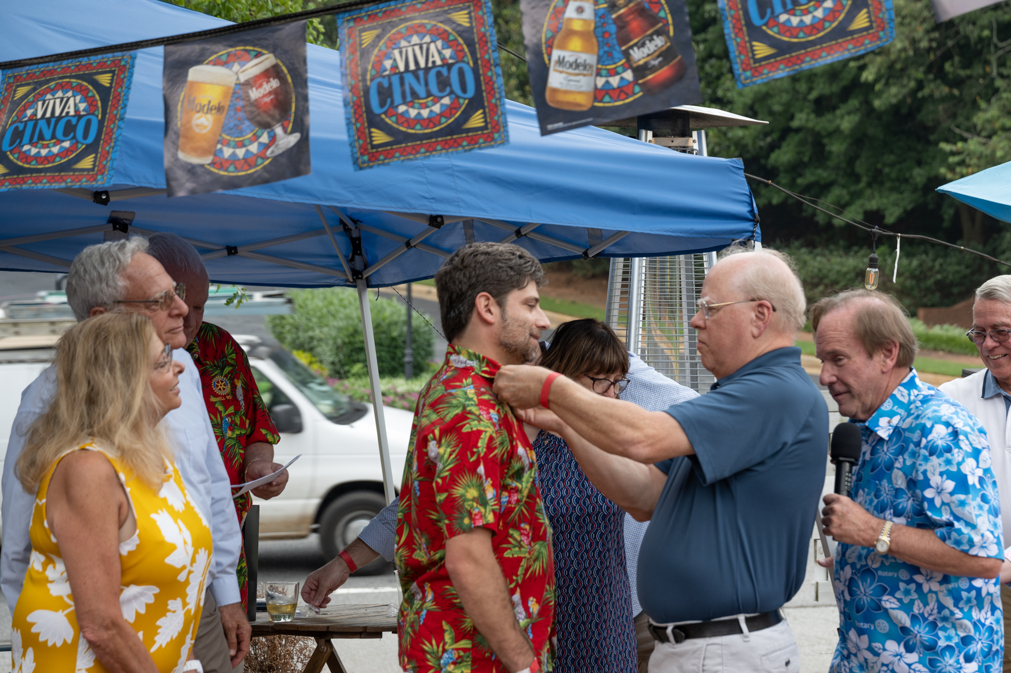 Each year we throw a big party to celebrate the last year and kick off the new Rotary year. We do some official business by installing the new president and board but it is mostly big fun for our extended Rotary family. This year's party on Thursday, June 29 was at Roswell Gardens. There were many regular patrons out for a normal social evening who were exposed to Roswell Rotary.