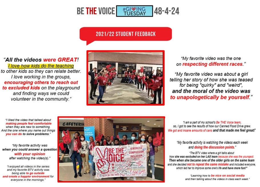 BE THE VOICE, born in the Rotary Club of Roswell in 2014, supports both Students and Staff. The heartbeat of our initiative revolves around a 12-week video series that showcases diverse peer social influencers sharing personal experiences of how they inspired change within their school and community.