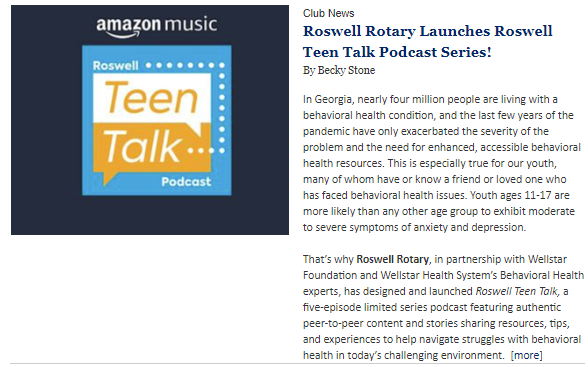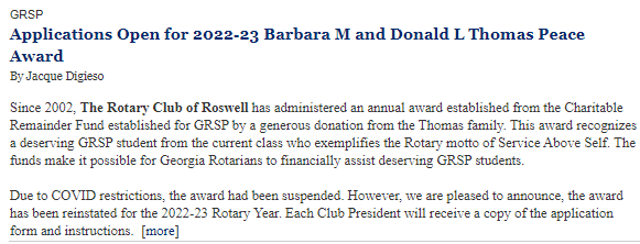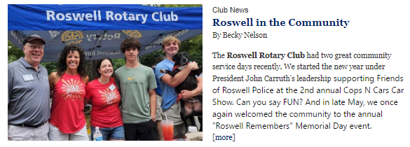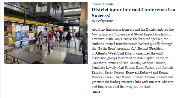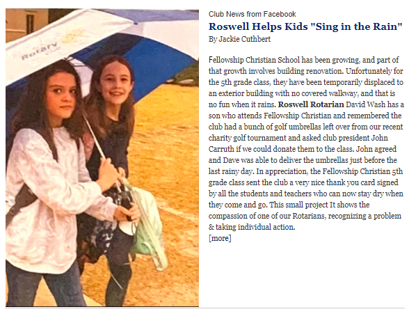 Monthly District 6900 sends an online newsletter out to all Rotarians in the district. Roswell Rotary reported in several of these issues stories about service projects including our Community Impact Project with Wellstar Hospital System, Interact Conference, World Polio Day Cornhole event and donating unused golf umbrellas to an area school.