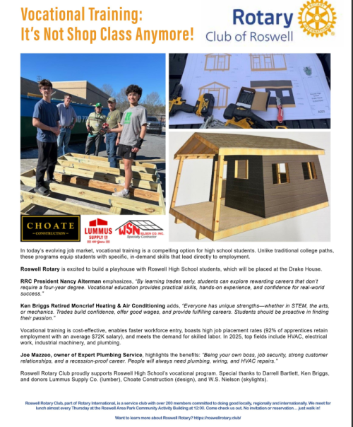 As part of our Vocational Awareness Initiative, RRC is teaming up with the Roswell High School (RHS) Construction Program to build a custom-designed playhouse for the children of Drake House, a local nonprofit that provides housing and support for homeless women and their families. This project not only brings much needed joy to children but also fosters valuable hands-on experience for the students involved, allowing them to develop key skills in the trades.